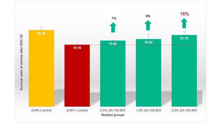 Survival and resistance: After the infection period, the untreated “Positive Control” group showed classic EHP symptoms, including empty guts, soft shells, and pale hepatopancreas tissues. However, the groups fed with GA-100 BIO showed a markedly better outcome. By the end of the 28-day post-infection period, shrimp fed with GA-100 BIO at 2.0% inclusion achieved a survival rate above 80%, significantly outperforming the untreated group.