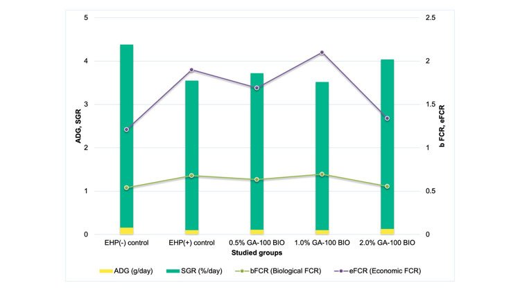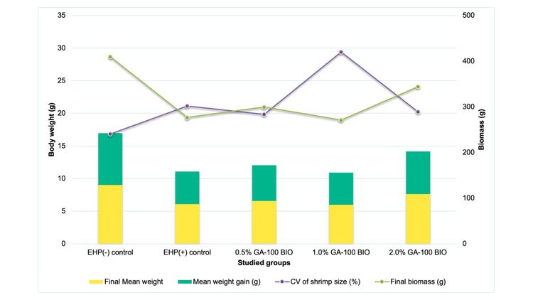 - Superior weight gain: Shrimp fed with 0% GA-100 BIO showed the best final weight and biomass.