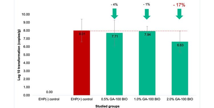 Fighting the infection: When the hepatopancreas samples were checked by qPCR to determine the impact of the GA-100 BIO supplementation on pathogen levels, the results showed that GA-100 BIO at 2.0% effectively suppressed EHP replication, maintaining the EHP load at a significantly lower intensity of approximately 10^6 copies/g compared to the untreated control, which reached nearly 10^8 copies/g.